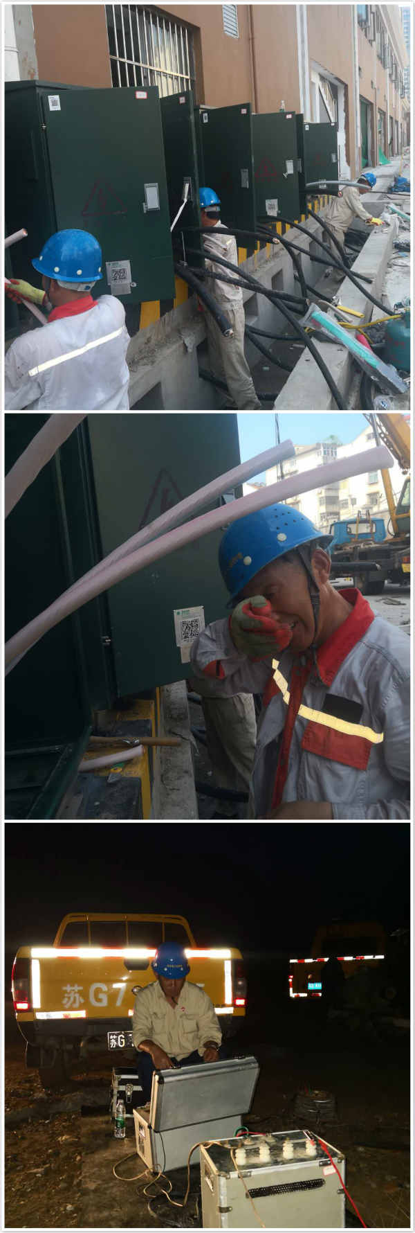 傍晚,剛剛干完活還沒吃飯的他們,又接到灌西和風風電項目電纜檢修任務,顧不上休息,立刻驅車前往80公里外的灌西施工現場,對電纜做實驗,找出故障點并進行更換。直至22點,才完成搶修任務。隨后,他們立即返回連云區,準備第二天的工程施工。