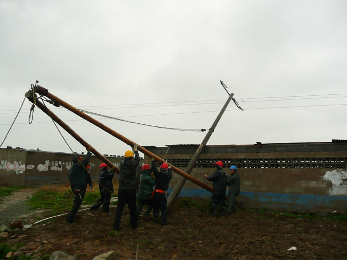 2月3日(正月初九)早上五點(diǎn)多,臺(tái)北供電所電力搶修值班室電話急促響起,變電所操作工反映10KV太和線跳閘失電。10KV太和線是臺(tái)北供電所非常重要的一條供電線路,是向順天木業(yè)、蘇交集團(tuán)、市政瀝青等大型企業(yè)供電的重要通道,失電意味著企業(yè)生產(chǎn)停工。接警后,供電所外線組組長(zhǎng)孫忠青立刻帶人沿線全面檢查。經(jīng)過(guò)兩個(gè)小時(shí)的排查,終于發(fā)現(xiàn)處于線路末端的高速公路低壓線路的五根電桿被施工的挖掘機(jī) 撞斷拉折。獲此情況,所領(lǐng)導(dǎo)立即組織人員,準(zhǔn)備材料,協(xié)調(diào)吊車,安排運(yùn)送電桿。這時(shí)天空正下著小雨,更增加了施工的難度。為了盡快搶修,恢復(fù)供電,搶險(xiǎn)隊(duì)伍加速向事發(fā)地點(diǎn)開(kāi)進(jìn),寒風(fēng)中的雨滴,打在職工的頭上臉上,大家毫不在意,一心撲在搶修線路上。運(yùn)送電桿的道路泥軟地陷,機(jī)器吊裝遇到死角,他們就肩扛手拉。為了搶時(shí)間,爭(zhēng)速度,他們中午就在工地吃點(diǎn)快餐。在全體職工的共同努力下,到下午五點(diǎn)左右全面完成了搶險(xiǎn)工作。