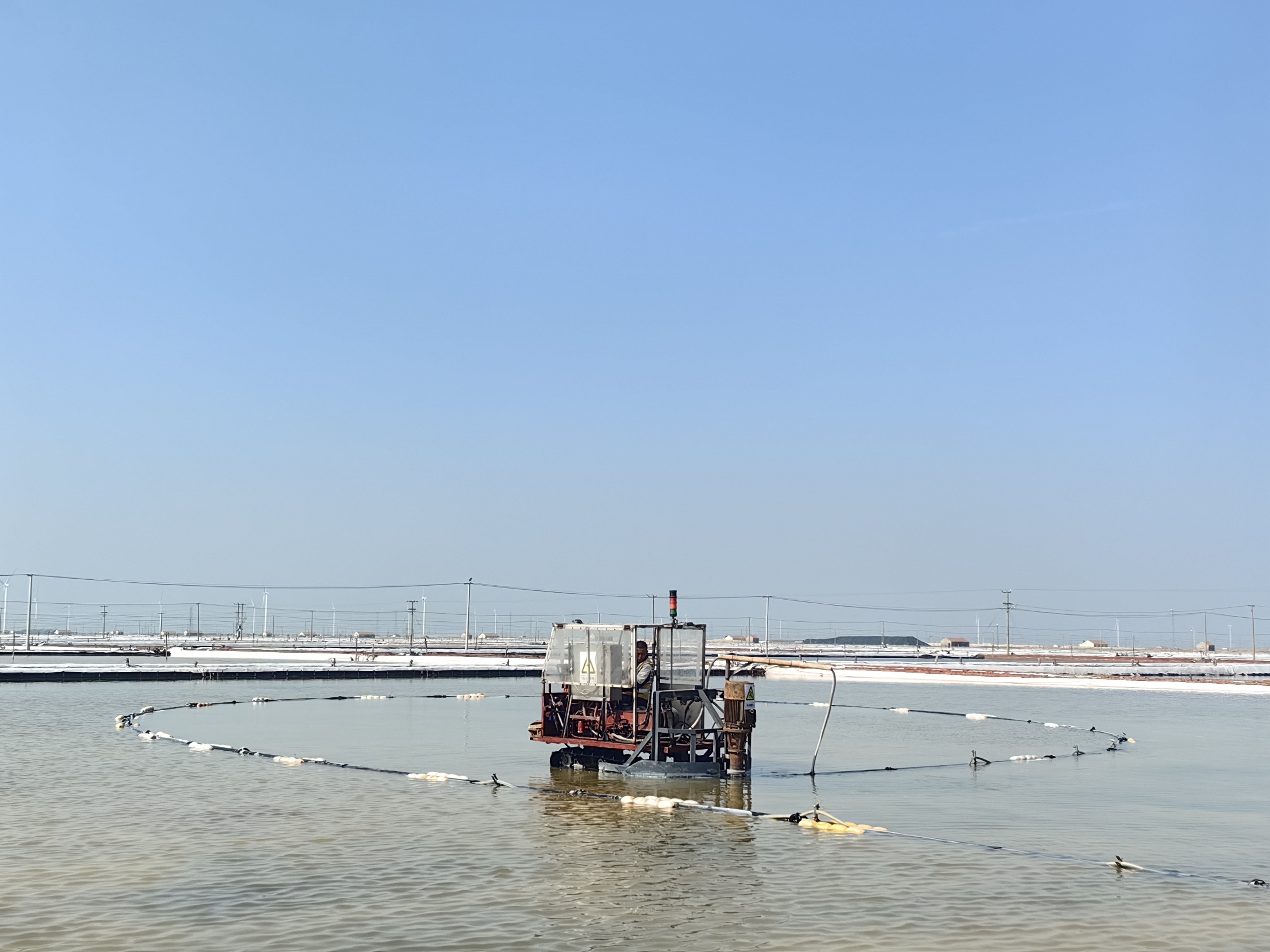 在八班扒鹽現場,一臺唐三零扒鹽機正在鹽池里進行扒鹽作業,唐三零操作手駕駛著機械,在鹽田中央緩緩行進著,不時的回頭觀察鹽泵吸鹽情況,確保扒鹽管道順暢。遠處的廩基內,大廩工正在熟練地利用分流板對鹽篩中傾瀉下的原鹽進行引導分流,熟練地打好廩墻。