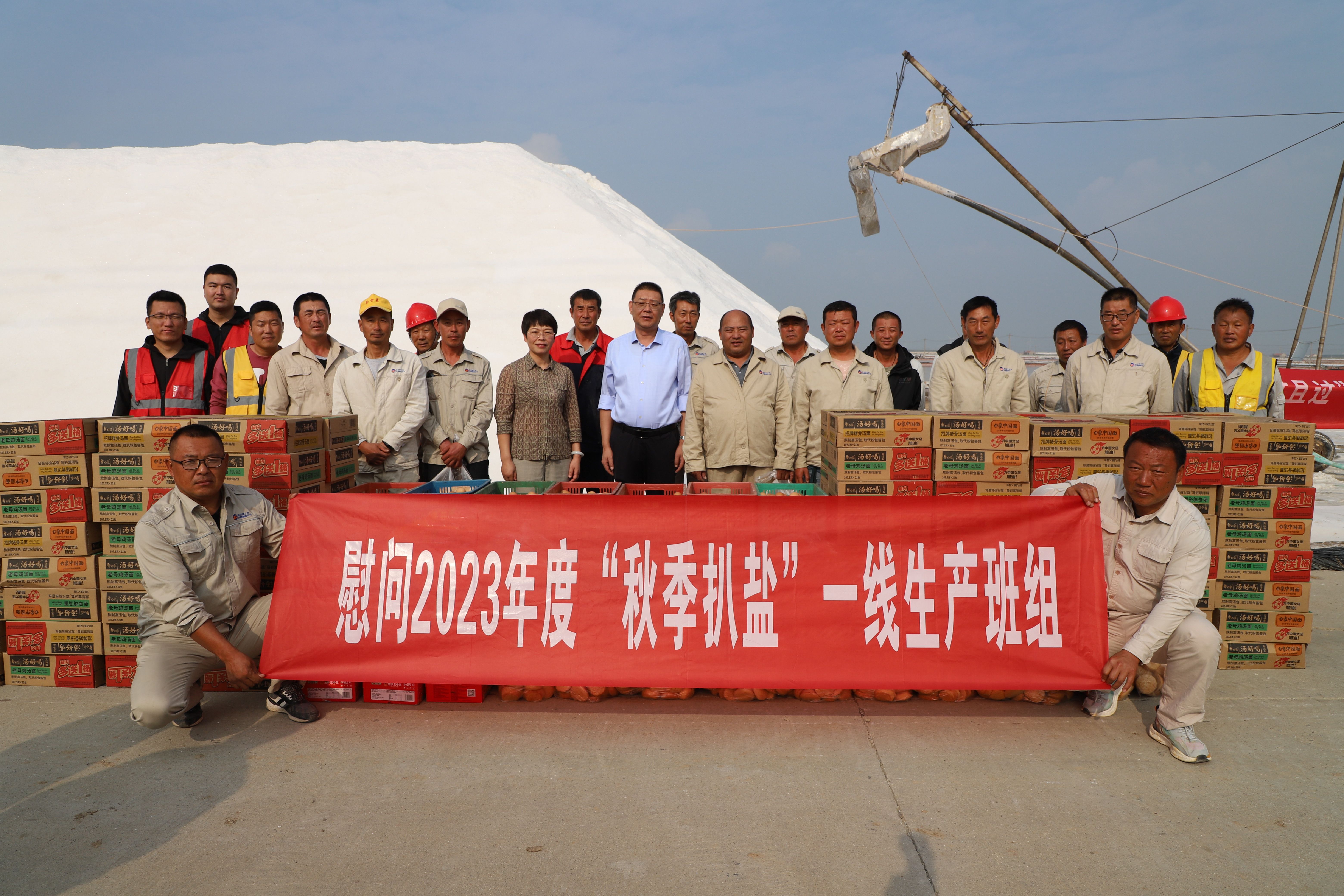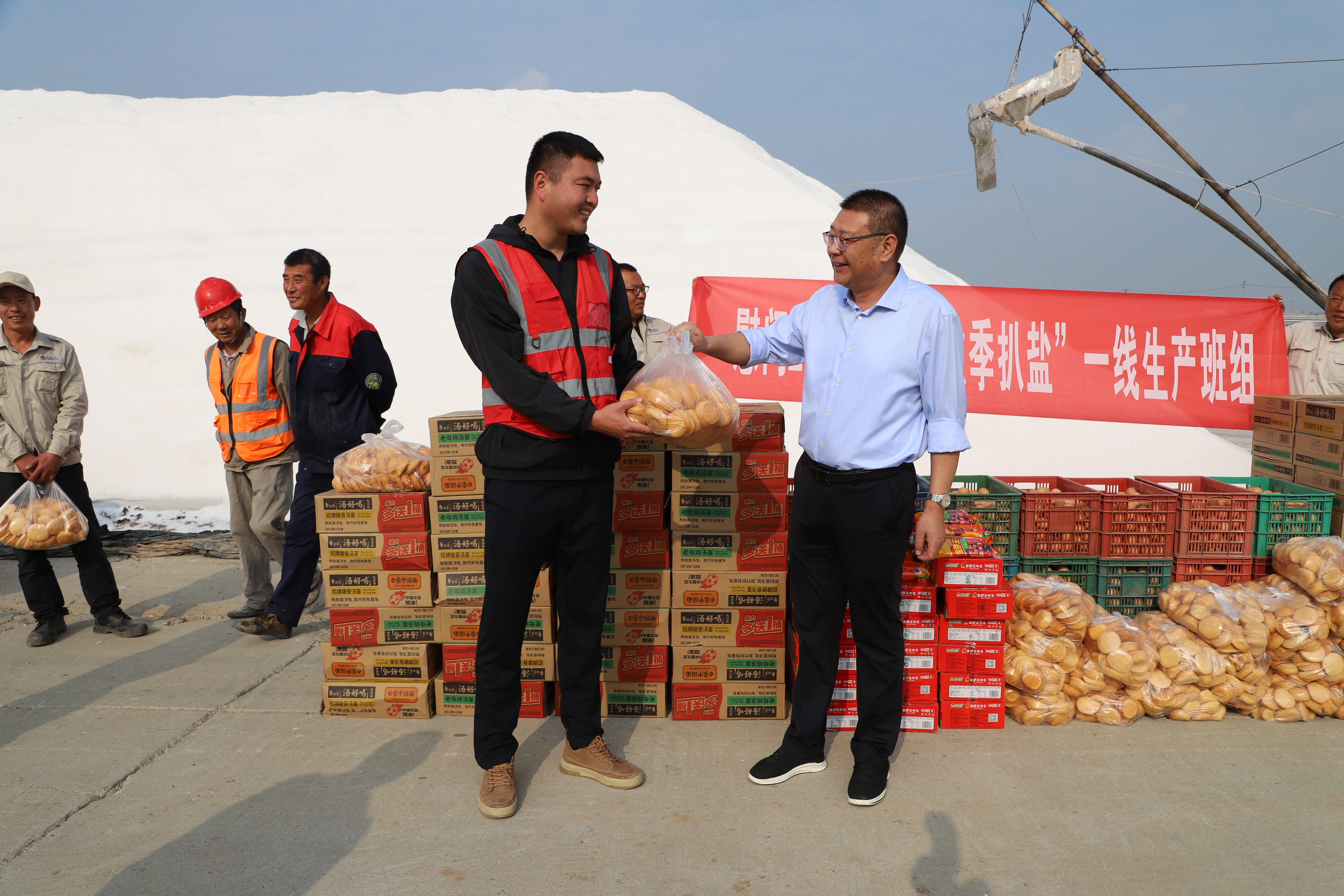 “你們辛苦了,我代表公司來看望大家。”在新河五班,孫政權與扒鹽現場職工握手問好,感謝他們為日曬制鹽公司的原鹽生產所付出的辛勤努力,叮囑他們要落實落細扒鹽安全生產措施,并送上雞蛋、方便面、火腿腸、雞蛋糕等物品。