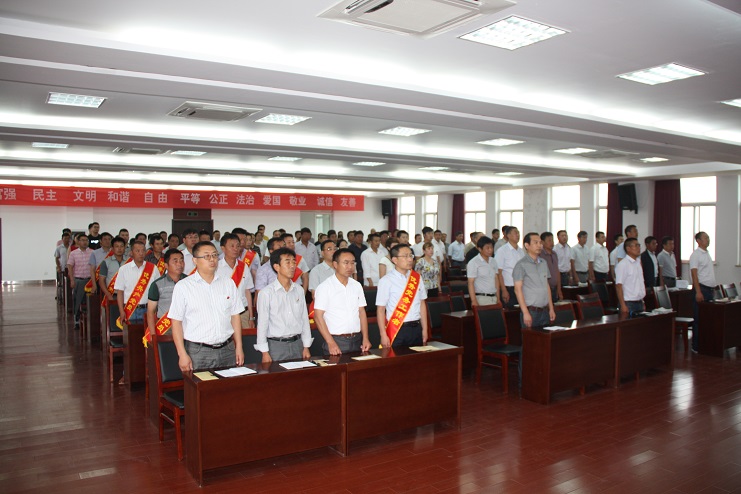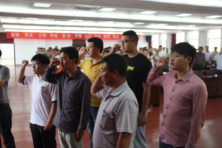 伴隨著雄壯的《義勇軍進行曲》,表彰大會正式拉開帷幕,在黨建工作部部長卜海的帶領下,6名新黨員面對鮮紅的黨旗莊嚴宣誓,與會老黨員共同舉起右拳,重溫入黨誓詞。新黨員代表吳凱、老黨員代表靳國祥分別代表新老黨員做表態發言。隨后,黨委副書記王保平宣布表彰決定,對新河黨支部等5個先進黨支部、吳慶剛等20名優秀共產黨員和季興勝等5名優秀黨務工作者進行表彰。