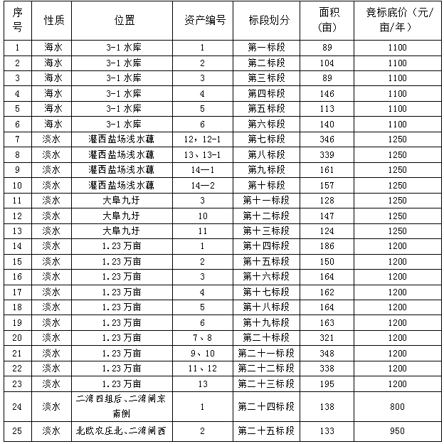 三、競租池塘各標段競標底價: