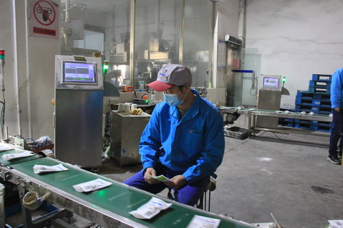 包裝鹽車間生產班長王東海巡視生產線