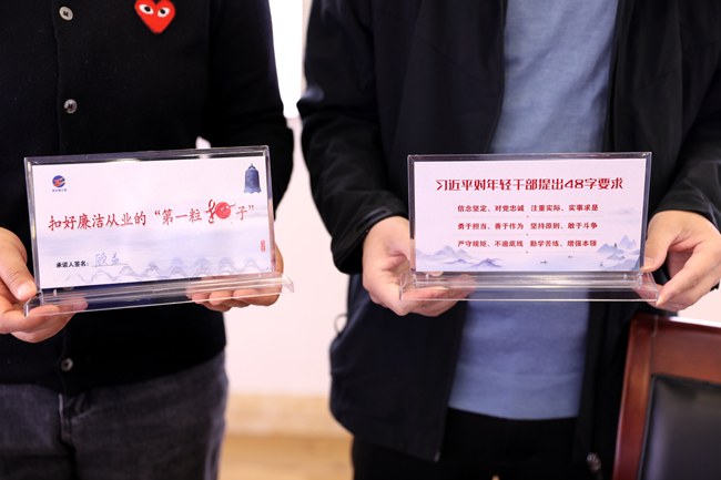 ? ? ? ?會后,公司紀(jì)委為10名新提拔干部發(fā)放了廉潔承諾桌牌,提醒他們常把“廉”字記心間,扣好廉潔從業(yè)的“第一粒扣子”。(青紀(jì))