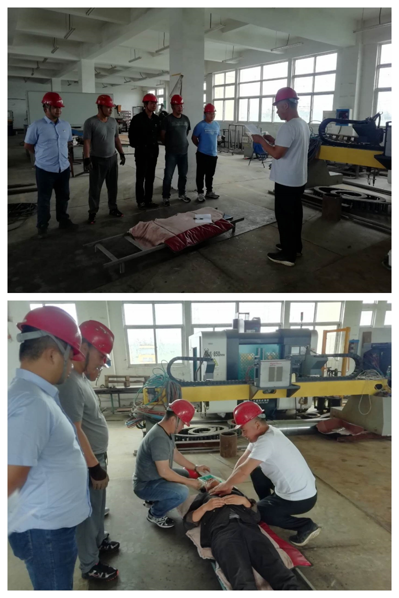本次演練方案模擬在精工車間正常生產過程中,因對電氣設備沒有經常性檢查,液壓切板機切板時掉落的鋼板未采取防范措施將電氣電纜砸斷搭鐵,造成液壓切板機金屬外殼帶電,作業人員在正常操作機床時造成觸電事故傷害。當同事發現有人觸電后,立刻做出救援反應,切斷電源將觸電人員安全隔離開后抬到擔架上進行搶救。并同時上報應救援指揮組,指揮組迅速做出響應,啟動防觸電應急預案,大家按應急預案的分工迅速開展救援工作,撥打120急救電話、拉警戒線、查看傷情、緊急搶救、人工心肺復蘇等,直至觸電者蘇醒,在大家的共同協作下演練圓滿成功,翔立分公司湯占國總經理對此次演練效果進行了總結和點評。