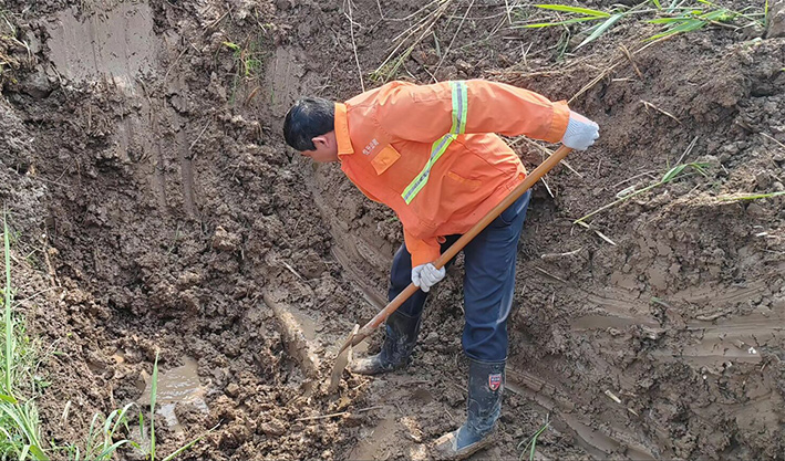 市政分公司組織搶修人員迅速到場,調集挖機與搶修材料,有序開展應急搶修。維修人員首先對漏水管道實施開挖,經過維修人員仔細挖開后確定直徑110PVC管道老化導致管道連接端裂開。查明原因后,制定了相應可行的搶修方案。搶修過程中,大伙不畏困難、分工有序,相互協作,在滿是泥濘的坑中開展維修作業。機械開挖、人工配合清淤、更換損壞管道、增設哈夫節等一系列的步驟,一通操作下來,搶修人員人人汗流浹背。經過3個多小時連續奮戰,高效完成此次搶修任務。
