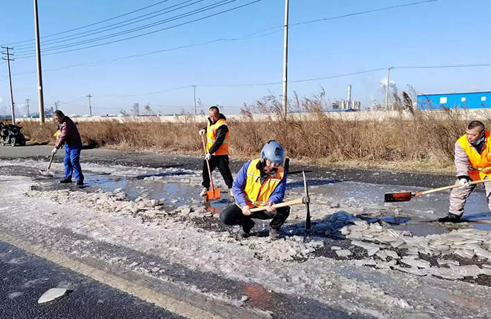 近期由于受冷空氣影響,氣溫低下,園區(qū)道路低洼積水處產(chǎn)生大面積結(jié)冰現(xiàn)象,如不及時清除,嚴重造成車輛側(cè)翻事故發(fā)生。道路排查現(xiàn)場,管理人員及時與園區(qū)二班對接,聯(lián)合開展“破冰保暢通”突擊活動。大家各負其責(zé),齊心協(xié)力,揮動手中鐵銑、羊鎬,經(jīng)過近4個多小時共同奮戰(zhàn),撬動冰塊近400多塊,清理積水300多平方、20多處。